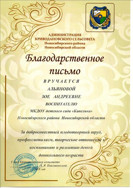 Администрация Криводановского сельсовета Новосибирского района Новосибирской области. Благодарственное письмо за добросовестный плодотворный труд, профессионализм, творческое отношение к воспитанию и развитию детей дошкольного возраста.