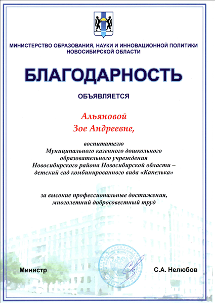 Министерство образования, науки и инновационной политики Новосибирской области. Благодарность за высокие профессиональные достижения, многолетний добросовестный труд